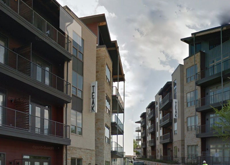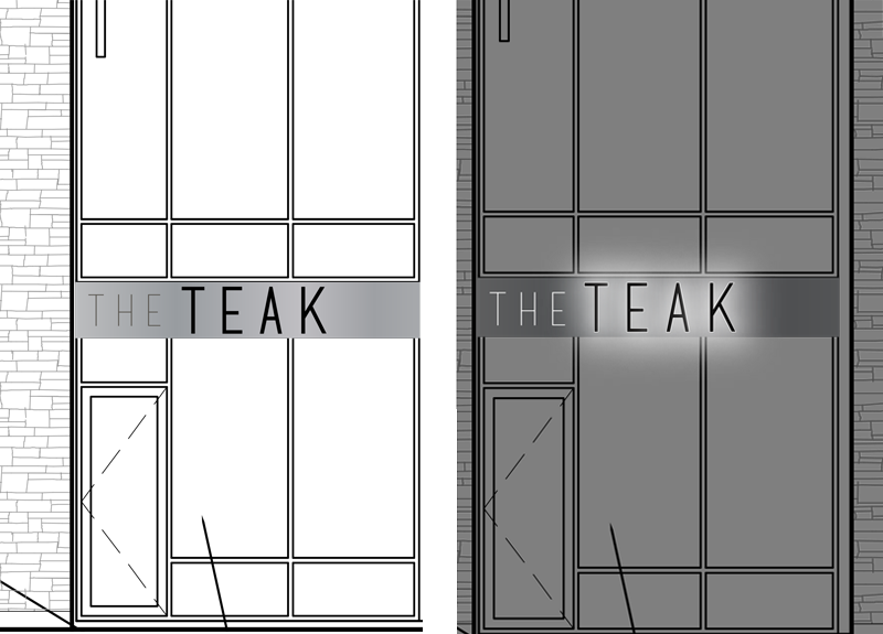 The Teak is a multifamily development in Dallas, TX. There are three exterior signs in this project. A leasing office awning and two blade signs.